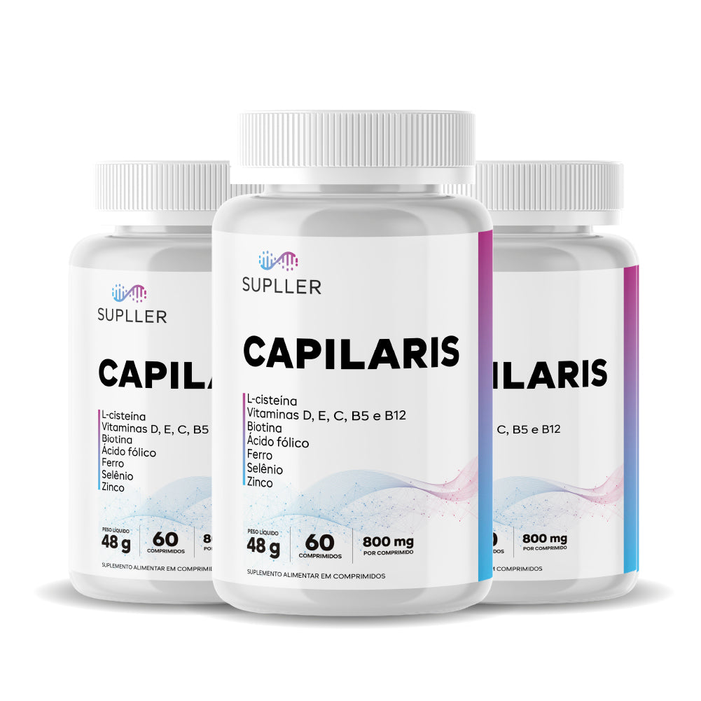 O Capilaris é um suplemento que ajuda a fortalecer os cabelos, unhas e pele. Sua fórmula rica em biotina, L-cisteína, zinco, ferro e vitaminas do complexo B contribui para o crescimento saudável dos fios, resistência das unhas e melhora da saúde da pele.
