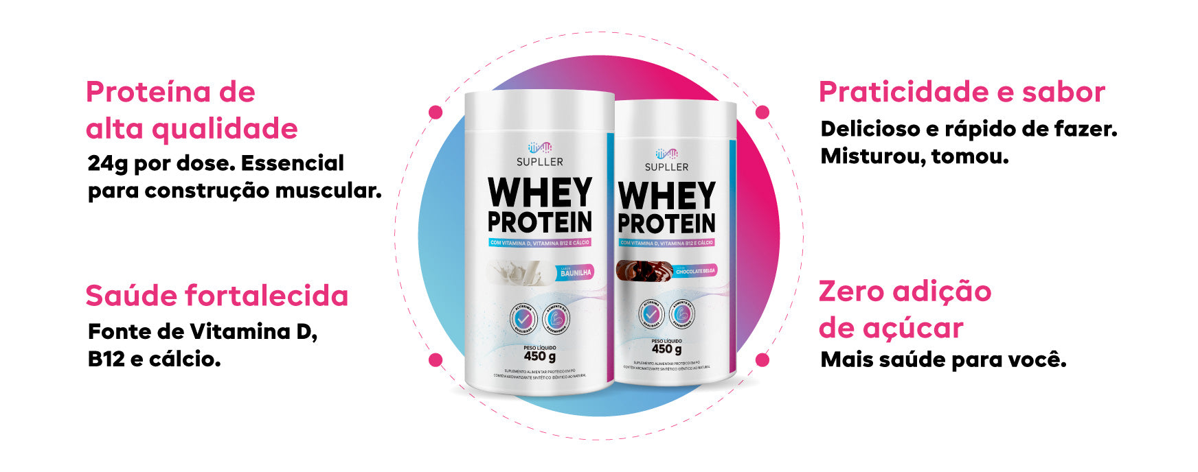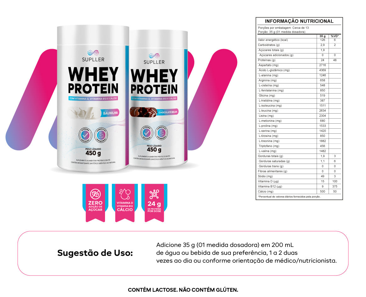 O Whey Protein da Supller é a combinação perfeita de nutrição avançada e sabores irresistíveis. Com 24g de proteína por dose, é ideal para pacientes bariátricos ou para quem deseja manter o foco em uma alimentação saudável e equilibrada. Disponível em três deliciosos sabores: Baunilha, Cappuccino e Chocolate Belga, para tornar sua suplementação mais prática e saborosa